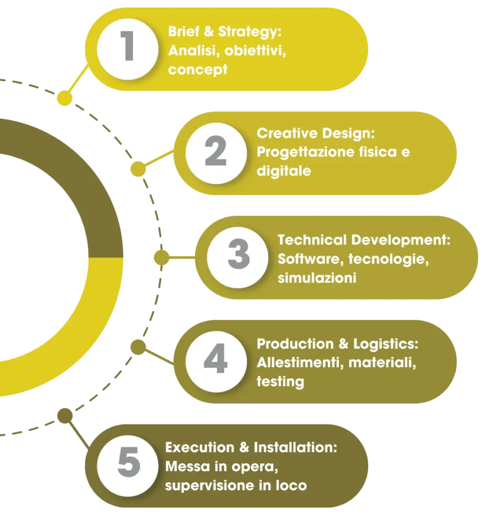 Ascoltiamo i bisogni del cliente, creiamo soluzioni su misura e le trasformiamo in esperienze fisiche o digitali, massimizzando impatto e ritorno dell’investimento.